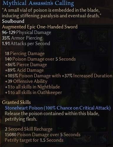 このビルドに適した武器を見つけるのは難しくありません。多くの+酸と毒のダメージと攻撃速度を備えたすべての片手近接武器で十分です。武器を最大限に活用するには、両方の武器で Vitriolic Gallstones を使用することをお勧めします。したがって、ダメージを増加させるオーラをさらに 2 つ持つことができます。物理から酸への変換は、シャドウ ストライクのダメージを大幅に増加させます。これは、そのダメージの 20% がすべての酸ダメージ ボーナスによって修正されるためです (武器が物理ダメージを与える場合)。また、両方の武器を Coven of Ugdenbog の Blight Beast Pustules または Outcast の Outcast's Venom で強化することをお勧めします。