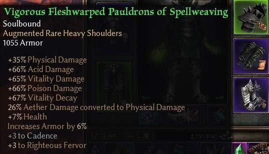これらの肩は、後半のゲームでダースで見つけることができます.マルマスで私のものを手に入れました。 They alone boost your damage by about 2000. The health bonus is also pretty neat.