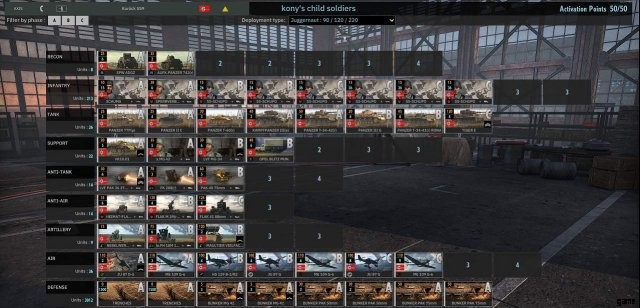これらの師団のゲームプランは、初期の歩兵が不足しているためにわずかに悪いことを除いて、フェーズ A と B の通常のジャガーノートのように展開されます。フェーズ A とフェーズ B では歩兵の数が少ないため、できれば町ではなく、マップのスライスを選択します。ある種の混合/中距離エリアが適しているため、対戦車砲と戦車に頼ってフェーズを維持できます。 A と B. 歩兵には細心の注意を払ってください。これらのデッキの動作のリプレイとビデオがいくつかあり、フェーズ A と B をどのようにプレイするかについての優れた指標となるでしょう。フェーズ B の終わりまでに、フェーズ C がヒットしたときに歩兵のプッシュをサポートできるあらゆる種類のユニットを取得し始めることをお勧めします。スパム可能な中戦車、対空砲 (できれば大口径)、対戦車砲、飛行機、大砲などを考えてみてください。前線が遅く、フェーズ C の前にこれらすべてのものを購入する時間がある場合は、成功する可能性があります。