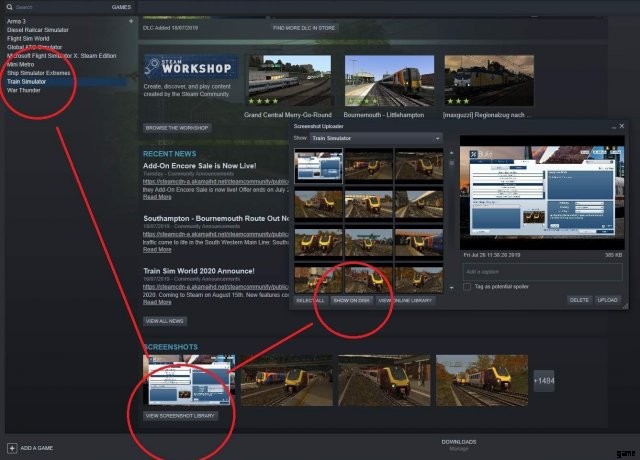 Steam では、ゲーム -> Train Simulator -> 下にスクロールして スクリーンショット ライブラリを表示 します。 -> 次に ディスクに表示 を開きます .