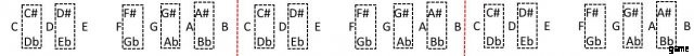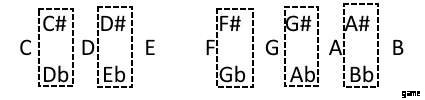 点線の各ボックスには 1 つの音符が含まれ、両方の名前が付けられています。したがって、C# と Db は同じ音符です。