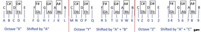 この暗号には 3 つのオクターブがあるため、存在する可能性のある音符の完全なセットは次のとおりです: