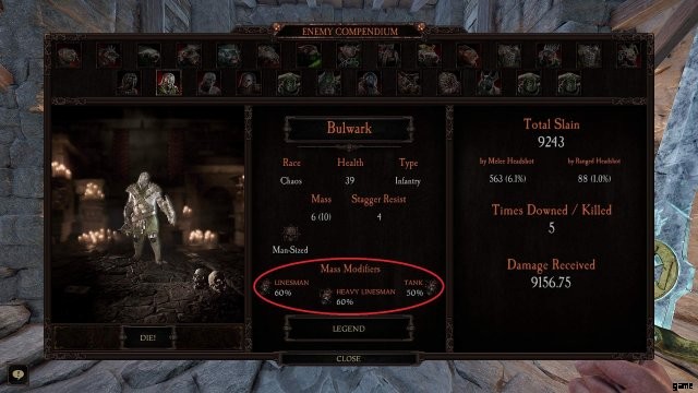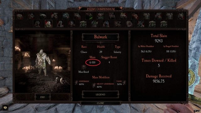 マス モディファイア: ラインズマン、ヘビーラインズマン、タンクを含む。 Armory/Bestiary で見つけることができます。ノックダウンした敵の質量は半分になります。