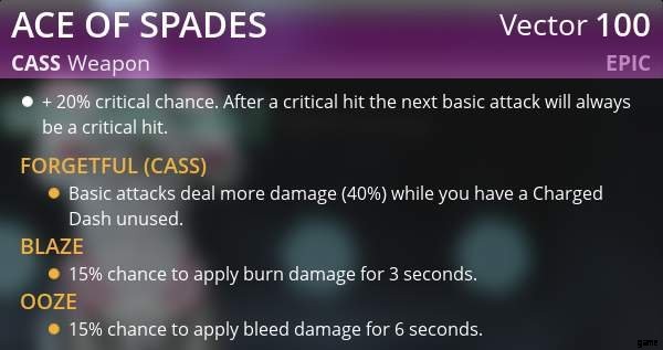 基本攻撃で 20% の確率で 100% のボーナス ダメージ (または x2 ダメージ) を与える。ウェポン スペシャルは、クリティカル ヒットがすでに行われている場合、1 つのスペシャル ボーナス クリティカル ヒットを保証します。