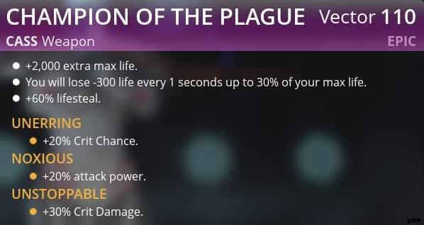 最初から 60% のライフスティール モディファーと、低体力のための疫病セット全体への直接的な相乗効果:基本攻撃で 50% 追加のダメージ (サポート ギア)、20% の確率でダメージをブロック (プロトタイプ ギア)。体力に対するペナルティは、常に最大 HP の 30% まで消耗します。