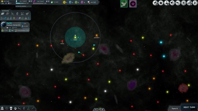 ターン 5 までに、私はすでに 1 つの研究プロジェクトを完了し、2 つ目の研究プロジェクトを選択しました。この場合、小惑星鉱山と私のフリゲート艦が近くの星系に関する情報を明らかにしました。これで、探査に集中すべき場所がわかり、すぐに研究する必要があることがわかりました。彼らの努力に基づく湿地の植民地化。