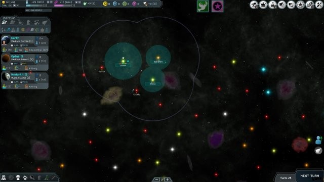 ターン 25 までに私の人口は増加し、無料の支援船が利用可能になりました。私の新しい植民地は何も生産していませんが、私の研究活動と財務に良い影響を与えていることがわかります.また、初期のインフラストラクチャを使用して船のサポートポイントを増やしました。私の HW は現在コロニー リーダーを配置しており、私の全体的な努力により、前哨船の完了時間が大幅に短縮されました。