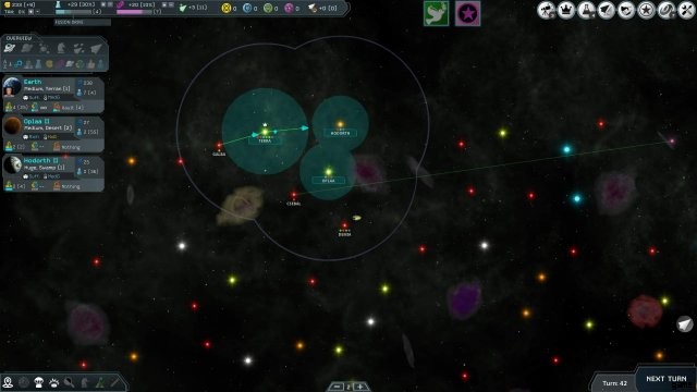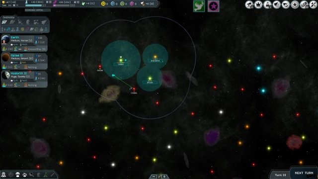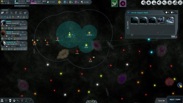 このウォークスルーはターン 65 で終了します。ショットを見て、いくつかのことに注意してください。私の財務は良好ですが、過剰な現金をあまり生み出していません。これは、私が建設した建物の維持費によるものです。たとえば、金庫室や兵舎とは別に、地球には宇宙エレベーターもあり、船をより速く生産することができます.そこの植民地船が完成したらすぐに、私は経済首都を建設して、より多くの資金を生み出し始めます.