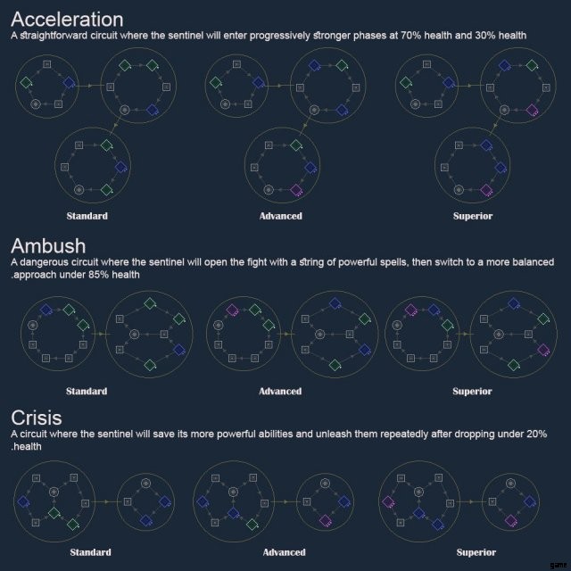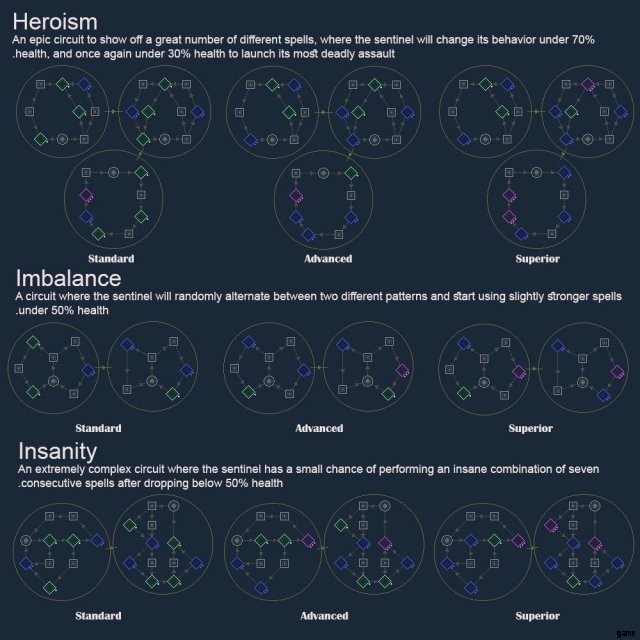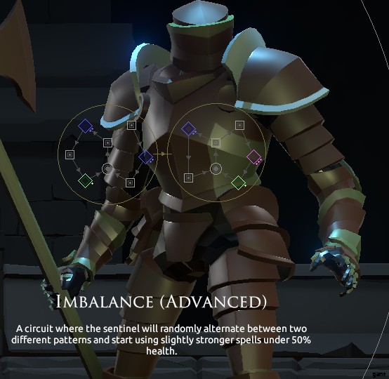 「センチネルが 2 つの異なるパターンをランダムに交互に繰り返し、体力が 50% になると少し強い呪文を使い始める回路。」