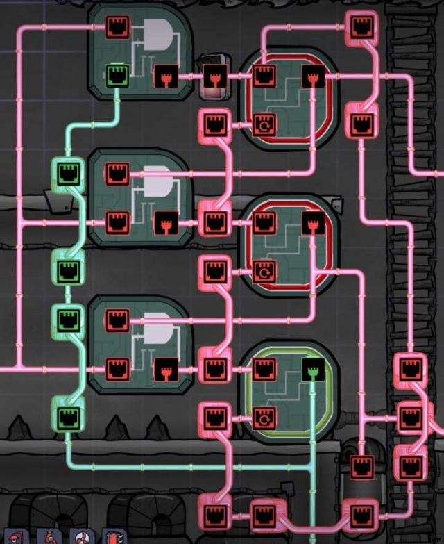 このシステムの最も重要で複雑な部分は、3 つの貯水池のどれが現在どの状態にあるかを管理することです (一度設定すればそれほど複雑ではありません)。このために、バッファ(最小に設定)、XOR、およびスイッチによって生成されたパルスを使用しています。オンまたはオフに関係なく、スイッチを切り替えるたびに、次のゲート セットを更新するパルスを放出します。