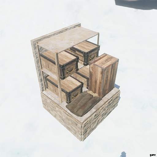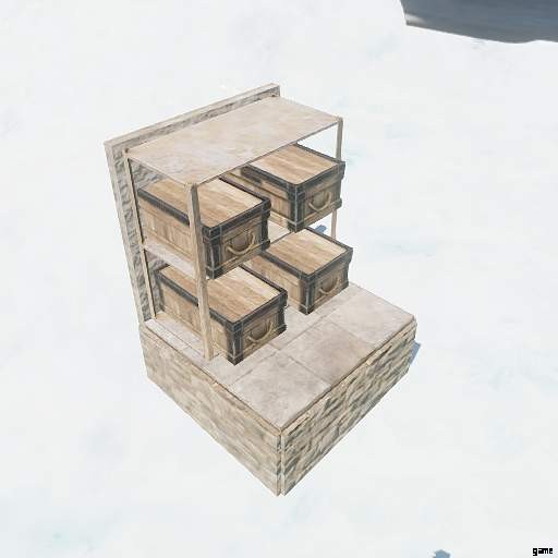 非常に重要なアイテムを一番上のクレートに入れることができます。襲撃された場合は、道具棚の横にあるバッグでスポーンし、それらを一番上のクレートの下にあるクレートに移すことができます.