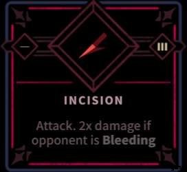 最初に使用した攻撃カードは相手に流血を与え、その後 2 つの INCISION を使用して合計 91 のダメージを与えることができます。
