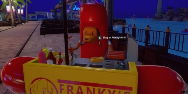 フランキーズ グリルは、フレッシュ アンド セレブレーションの外のボードウォーク、ポセイドン ローラー コースターと観覧車の前にあるホットドッグ スタンドです。