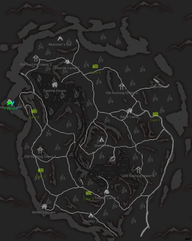 これが BIGFOOT の完全な地図だと思います。 地図 そしてヒント?チートだと思うけど、未知の洞窟の岩棚に立ってビッグフットを隅に誘い込むことができれば、彼が死ぬまでナイフで刺すことができる. クリックして拡大…