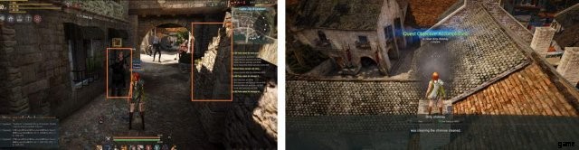 路地では、次のクエストの NPC を見つけることができます。クエストを受け入れ、反対側の階段を使って屋根に登ります。 2 番目の煙突に登って掃除し、下に戻ってクエストを手に入れましょう。