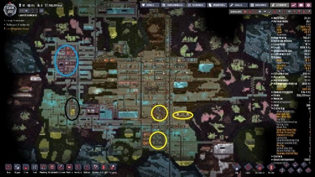 植民地には、かなりの量の産業が稼働しています。黄色の楕円は、既存の発電エリア (石炭、天然ガス、および手動発電機サイト) の場所を示しています。これらの領域はまだ蒸気タービンによって直接冷却されていませんが、ここでタービンが強く必要になるまでには少し時間がかかります.一方、青い円はコロニーの酸素発生プラントの場所を示しています。