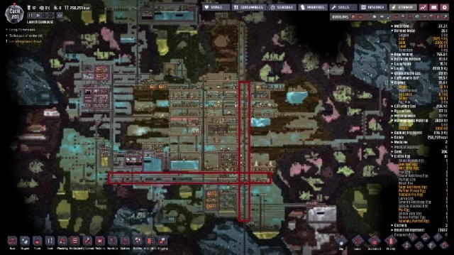 As the base grows, it can become tricky to route important resources everywhere. That’s part of why I like to focus on the central corridor design for the most important ones. Here’s a good example of how that’s working in the current colony: