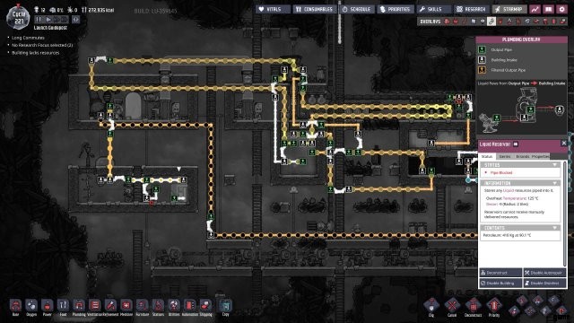 As you can see, I’ve already got a Dupe actively refining Crude Oil into Petroleum! The reservoir setup below is set up kind of like the Advanced Gas Storage from late in the mid-game guide. The system first prioritizes filling up the lone Liquid Reservoir – any Petroleum inside will be automatically forwarded to the first consumer. After that, any excess will be dumped into the main pool. Finally, if the Petroleum line into the Reservoir isn’t full and there is free Petroleum in the tank, the Liquid Pump will refill the Reservoir.