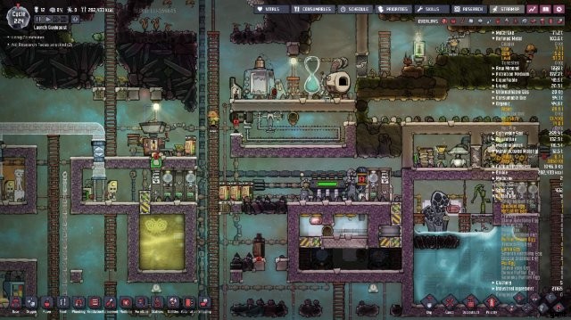 If you implemented the long-term Oxygen solution (the SPOM) from the mid-game guide, your colony should be producing enough cooled Oxygen for up to 16 Duplicants. That milestone was reached somewhat late in the guide, so at this stage, I’d say that your colony should probably have somewhere between 8 to 16 Duplicants. For every 8 normal (no Diver’s Lungs) Dupes, that Oxygen solution will need to consume 1 kg/s Water, so your colony’s permanent Water consumption should be under 2 kg/s at this point.