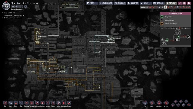 On the other hand, the Plumbing overlay shows that we aren’t using the central corridor for liquids very much. This is no accident on my part – the next arc of this guide will see this change dramatically. Note how we’ve kept the various loops largely outside of the main corridors; outside of a few stray Liquid Pipes in the vertical section from the early game, we have plenty of room to make bridges to cross any cross-sectional lines. (Those lines can be safely deconstructed; I’ve just been lazy about that.)