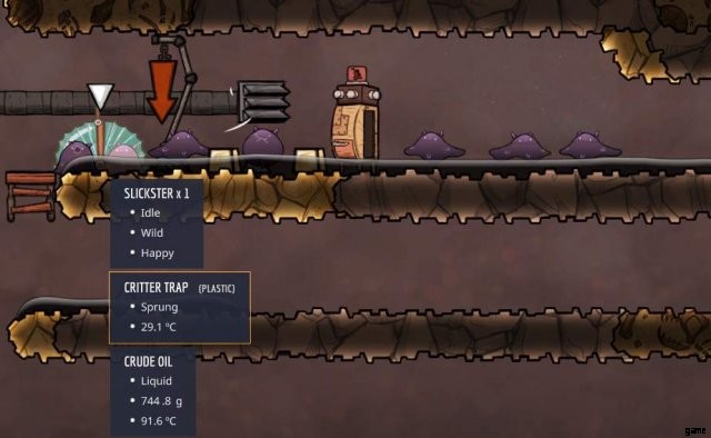 Now, a problem with that – Critter Traps overheat at 75 C, and temperatures in the Oil Biome are usually far above that. However, it does take a bit of time before trap overheats – if you place it, catch a Slickster, and relocate it quickly enough, the overheat bonus won’t be a problem. Note that Traps cost 200 Plastic and break after one use; fortunately, we can easily make more.