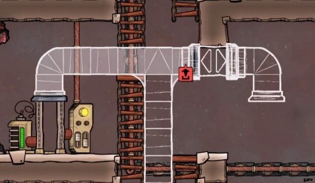 廊下の左半分には、小さな電源変圧器を追加し、主供給ラインから酸素を分配するためのガス バルブを配置するのに十分なスペースがあることに注意してください。 (どちらのタイプのトランスフォーマーも 2 タイルの高さがあるため、水平の回廊にはより大きなバリアントを簡単に収容できます。) 右半分は代わりに、垂直の回廊ではかなり重要なデュープの機動性に焦点を当てています。鋭い目で見ると、火柱の後ろに断熱ガス管があることに気付くかもしれません。これは天然ガス管です。廊下を通る別のガス パイプ ラインと追加の液体パイプを追加する余地さえあります。これは設計によるものです。
