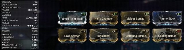>117.8% SC Riven:+60% SC 必要 =1x 60/60 Elemental (2 つのスロットを節約し、proc プールを最適化し、Chilling Reload で Viral を作成できるようにします)