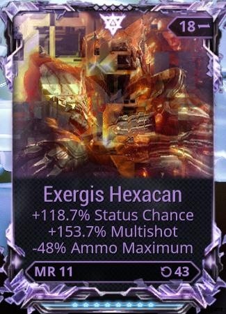ステータスベースのショットガンと同様に、最も重要な目標は、マルチショットが計算される前に 100% ステータス チャンスに到達することです。これは、Exergis に最低 +177.8% のステータス チャンスを追加することで達成できます (Riven なしで 3 つの 60/60 エレメンタル mod、平均的な Riven で 2 つ、完全な Riven で 1 つのみ)。 100% のスイート スポットに到達すると、すべてのペレットがすべてのショットで発動します。