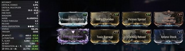 標準的な 100% ステータス ビルド。悪意のある拡散は現在、エクセルギスに悪影響を及ぼしません。 Ammo Stock と Chilling Reload は完全にオプションですが、強くお勧めします。 Vicious Spread を Vigilante Armaments に交換して、ショットごとに追加の ~2/3 proc を得ることができます。必要に応じて、Scattering Inferno を Shell Shock に置き換えることができます。必要以上のエレメンタル ダメージを追加しないように注意してください。これにより、proc プールが希釈され、Slash/Viral が発生する可能性が低くなります。 +Elemental% の代わりに +Damage% または +Multishot% を追加すると、ステータスの発動率を変更せずに全体的な DPS が上昇します。