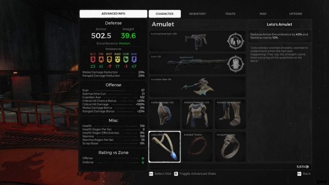 このビルドの救世主、レトのアミュレット。このアミュレットは最初はゴミに見えるかもしれませんが、アーマーの重量が 40% 減少したということは、ラディアント セットが中重量クラスのアーマーになったことを意味します。もう脂肪を転がす必要はありません。また、スタミナ消費が 10% 減少するのも嬉しい追加機能です!