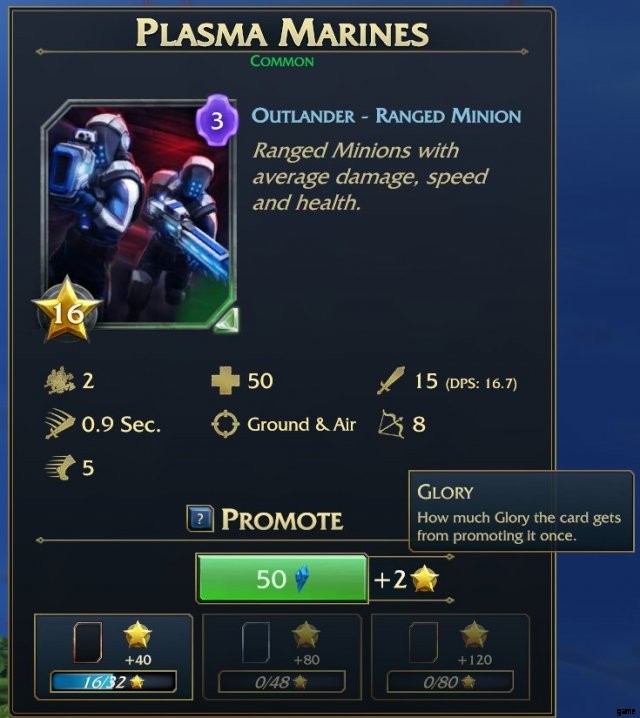 私のプラズマ海兵隊は現在、第 1 ティア 16/32 です。シャード 50 個で +2 グローリーを獲得します。 1 層だけを取得するには、400 シャード (50 シャード * プロモートを 8 回ヒット) を消費する必要があります。参考までに、別の 100 個のシャードを買いだめすると、好きなスプリーム カードを作成できます。パワー トークン ロールでチャンスをつかみ、追加のシャードを楽しみましょう。