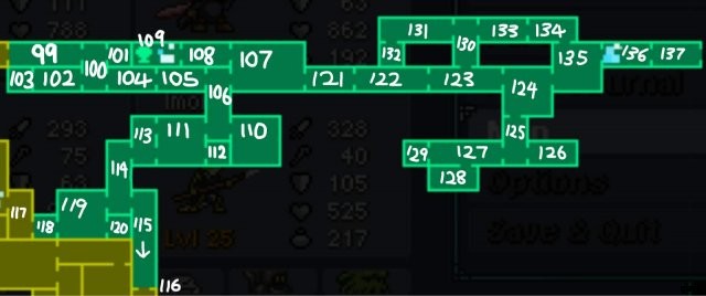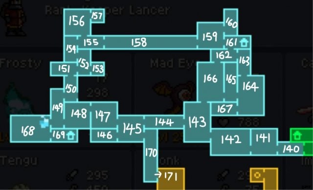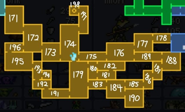 142. (2x Mogwai, 1x Yowie), (2x Ice Blob, 1x Mogwai), 通常のチェスト [Blue Gem, Red Gem, 2x Hazelnut], 右上の壁を壊して <141> チェストにアクセス.