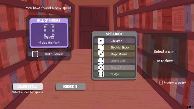 ナッジはどこに置けばいいですか?ドッペルダイスを入手した後はおそらく保持しないので、後で上書きする場所に置くことができます.また、あまり頻繁に召喚する必要はないので、6 にします (振り返ってみると、これは悪い決定でした。5 で Nudge を使用した方がはるかに適切であり、Hall of Mirrors は6 で問題ありませんでした.5 で Nudge を使用すると、私のスペルブックがより信頼できるものになります.戦闘のスクリーンショットで、ゲームの非常に遅いライトニング ボルトを取得するまで、私の 5 が非常に役に立たなかったことがわかります…)