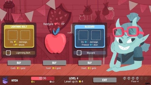 これは、2ダイスのエレメンタルスペルを販売する保証されたストアです. HPでも販売しています。リンゴと呪文の両方を買うことはできません。最後の敵を +1 ゴールドで倒してショック 1 を買えない限り。 5階のかなりの数の敵をシャットダウンし、いくつかのボス2をシャットダウンするので、私はむしろブリザードを今持っています.でもそうすると10馬力くらいで次の階に行くことになる。次の戦いは生き残れないかもしれない…ウィスプを倒すのは難しくない。 3 ショックで、彼は毎ターン 1 回の攻撃しか使用しません。りんごを買えば多分これで4ターンは生き残れる。それから私は完全な健康状態になり、まだライトニング ボルトを購入できます。よし、やろう。