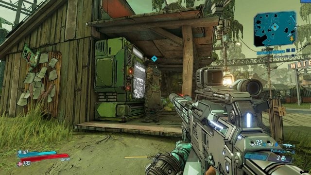 ドアがまだ詰まっている状態で、コントロール ボックスを撃って小屋へのドアを開けてください。