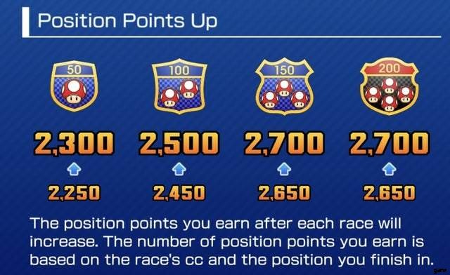したがって、150cc で 2500 ポイントを獲得するプレーヤー レベルにあり、レースで 1 位になった場合、ポイントは次のように決定されます:2500 x 1 =2500. ポジション ポイントは、プレーヤー レベルに応じて増加します。
