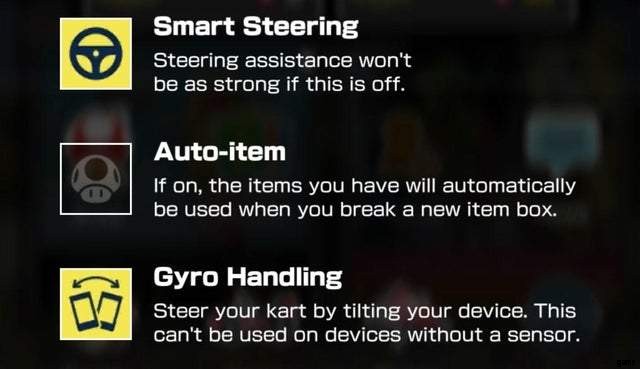マリオカート ツアーが初めてのマリオカート ゲームである場合は、スマート ステアリング オプションをオンにしておくと、ステアリングが少し楽になり、ゲームの他のメカニズムの学習に集中できるようになります。この設定はデフォルトでオンになっています。
