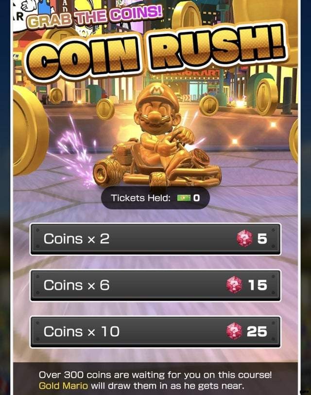 コインラッシュは、マリオカート ツアーの特別なモードで、ゴールド マリオになって、ゴールド コインで覆われたコースをレースします。コイン ラッシュをプレイするには、画面上部のゴールド コイン合計の横にあるプラス ボタンを選択する必要があります。
