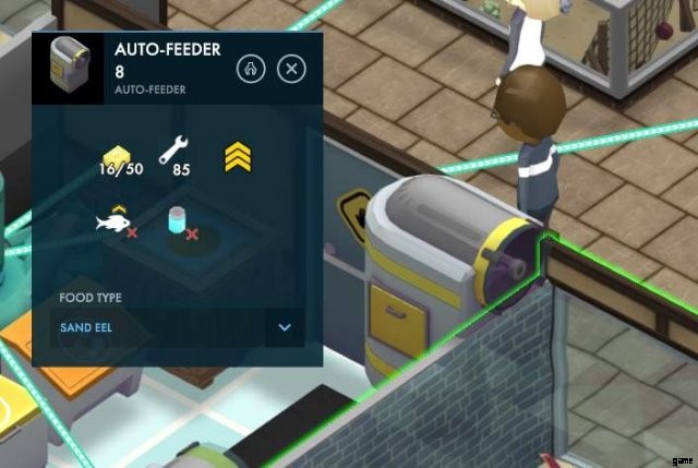 それでは、自動給餌器:すべてのタンクを接続して、すべての給餌スタッフを解雇する時が来ましたよね?まあ、それほど速くはありません。自動給餌器には、考慮する必要がある長所と短所があります。まず第一に、信頼性が 85 と比較的低いため、数日ごとに故障する傾向があり、スキル評価が 3 段階であるため、スキルの低いフィクサーの修理には長い時間がかかります。一日の始まりに壊れた自動給餌器は、食べ物を分配しませんが、修理するとすぐに自分自身を補充し、まだ必要な食べ物を分配します. (自動給餌器を修理する前に、スタッフがタンク内の動物に給餌している可能性があります。)