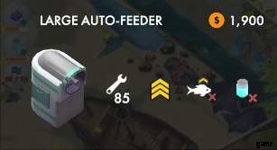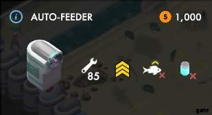 自動給餌器を設置したら、ゲームに存在する種類から食べ物の種類を選択できます:オレンジ色のペレット、緑色のペレット、ムール貝、ザルガイ、動物園のプランクトン、サンド ウナギ、海綿ペレット、アルテミア、ニシン、オキアミ、カニ、生きたラグ ワーム、または生きたマイシス シュリンプ。 1 つを選択すると、スタッフが補充する必要なく、その食品を無限に提供し続けます (ただし、通常の食品保存容器のように、自動的に補充するたびに費用がかかります)。