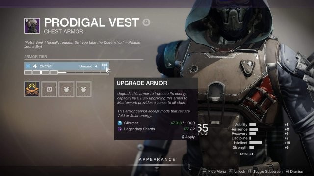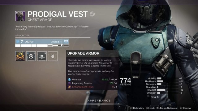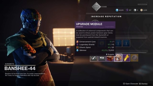 装備をアップグレードするには、まず素材が必要です。これらの材料は、フィールドで敵の死体を略奪したり、ガーディアンの装備を解体したり、宝箱を開けたり、惑星側のミッションからの報酬を集めたりすることによって収集されます。解体されたアイテムには、グリマー、レジェンダリー シャード、強化コアが含まれる場合があります。その後、アップグレードモジュールを取得するためにバンシー-44と材料を交換します。モジュールは、単一の機器アイテムをアップグレードするために使用されます。銃、肩、兜など