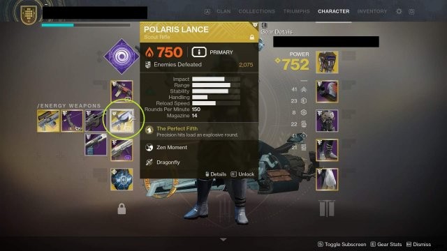 武器のエネルギー レベル、攻撃力、衝撃、範囲、安定性、ハンドリング、リロード速度、毎分ラウンド数、マガジン サイズ。