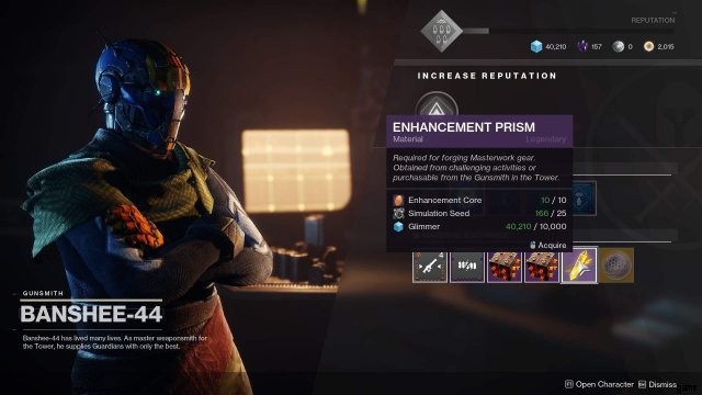 装備のエネルギーレベルをアップグレードすると、アイテムに変更を加えることができます。アップグレードには、ゲームの世界で見つかった材料が必要です。グリマー、レジェンダリー シャード、エンハンスメント コア、またはエンハンスメント プリズムの組み合わせ。