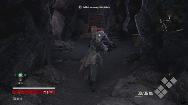 左側にはパトロール中の敵がいるので、彼にレッスンを教えてください。しばらくすると左側に敵が背中を向けてきます。これを機会に、バックアタックのやり方を学びましょう。これは非常に便利です。かなりのダメージを与え、無敵になるので、特に群衆の中でこの動きを利用するようにしてください.この敵を倒すと、敵が立っていた場所の後ろにいくつかのボックスがあることに気付くでしょう。それらをロールスルーして先に進みます。