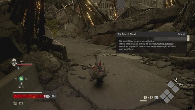 ゲームは、敵の猛攻撃を倒さなければならない戦闘状況である血の試練について知らせます。道をたどり、右側に固執すると、別の道の隣にチェストが見えます。