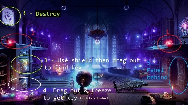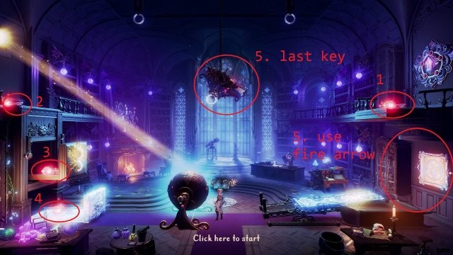 次に、キャビネットの後ろにあるボタンの火の矢を使用して、シャンデリアに着陸する最後の鍵を明らかにします.
