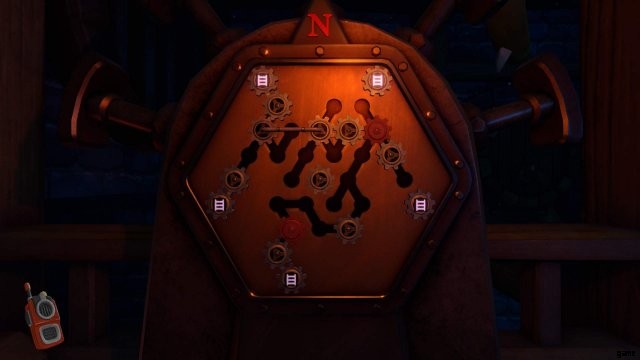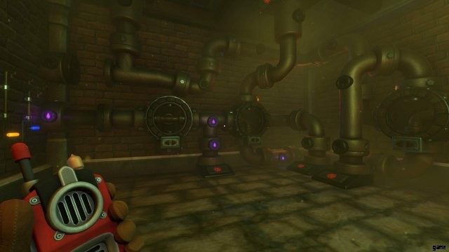 To do this, pull the yellow and blue levers and arrange three slots in two rooms of the pipe. Slots can be rotated, and pipes can be changed among themselves. This will be needed in the future.