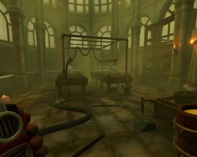 In one room with a reservoir there are three taps with fluids of three colors:green, orange and purple. There is also a small garden where you need to grow fruits, seed bags and scoops are scattered throughout the garden. You must take the necessary seeds and plant them on the bed and watered it with the correct liquid.