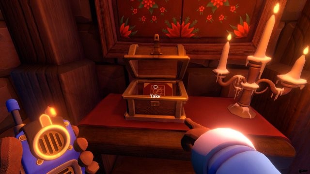 Your partner have also this items in his room. Place all 4 at the same position as in the other room. After that, a box will open on the second floor of both rooms in the corner. Both players must take a book from there.