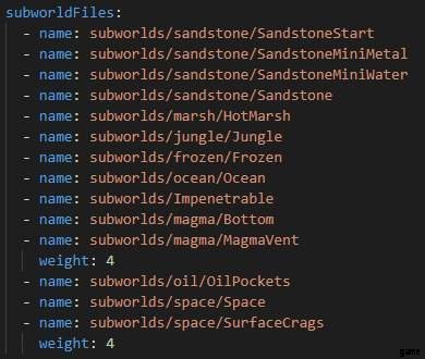 SubworldFiles は、worldgen 中にワールドで使用するためにロードされたすべてのサブワールド ファイルです。ワールドにサブワールドを生成するには、ゲームがアクセスできるように、ここにリストする必要があります。使用されるディレクトリは worldgen であるため、すべてのサブワールド ファイルはそのディレクトリ内に配置する必要があります。サブワールドのデフォルト フォルダーは worldgensubworlds です。サブワールドについては、このガイドのサブワールド セクションで詳しく説明します。